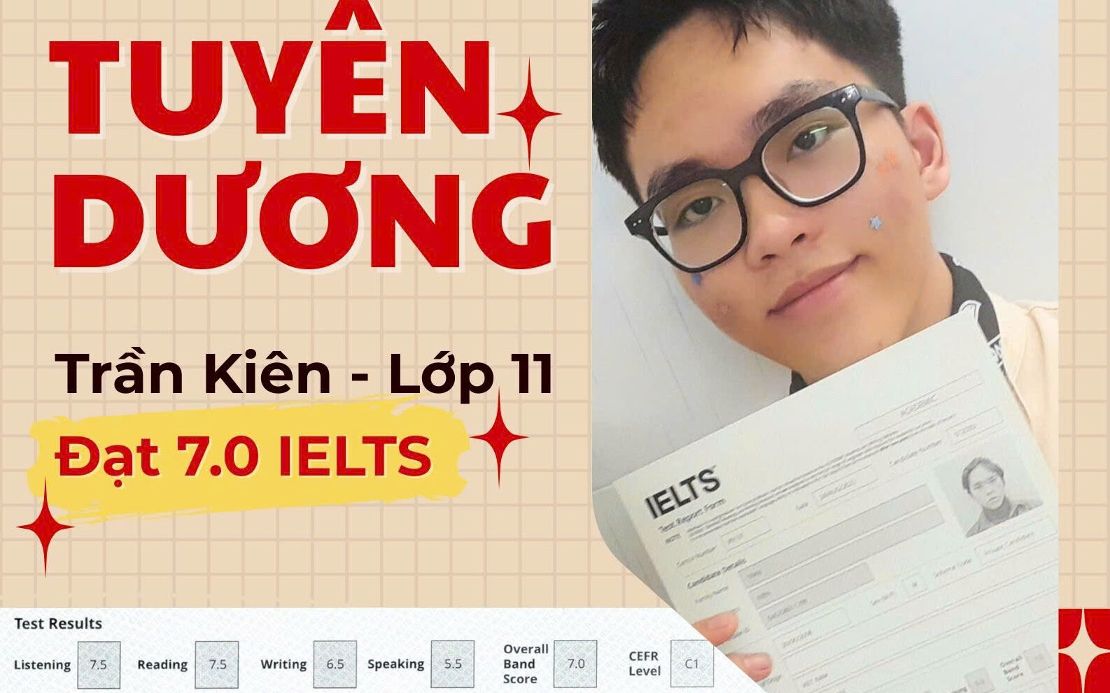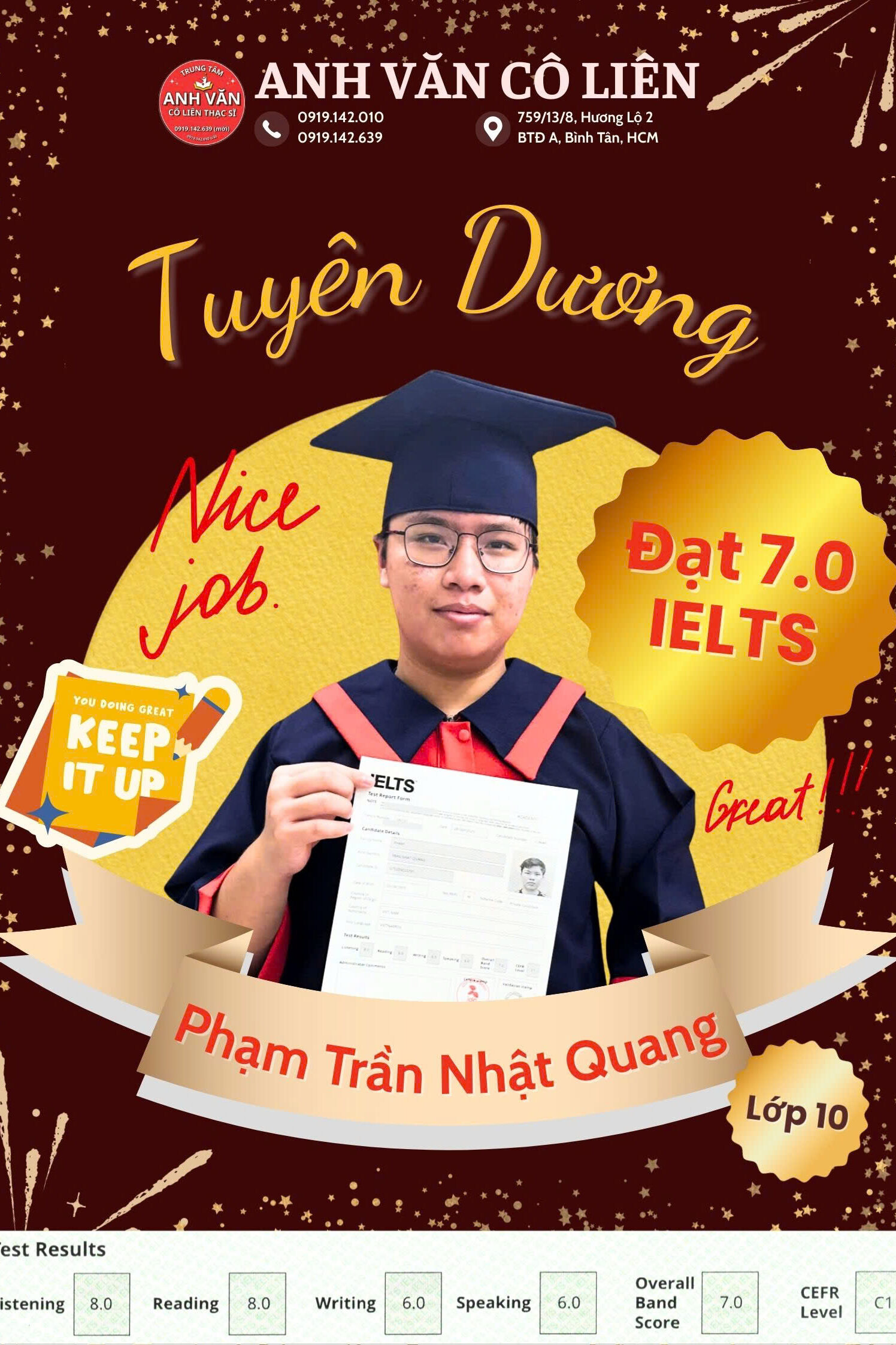 Nhiều học sinh tại Anh Văn Cô Liên đã đạt được những kết quả học tập đáng tự hào sau thời gian theo học tại trung tâm. Không chỉ tự tin giao tiếp bằng tiếng Anh, các em còn đạt điểm cao trong các kỳ kiểm tra trên lớp, tiến bộ rõ rệt ở cả 4 kỹ năng nghe – nói – đọc – viết. Đặc biệt, nhiều học viên đã chinh phục thành công các chứng chỉ Cambridge như Starters, Movers, Flyers với kết quả vượt mong đợi, tạo nền tảng vững chắc để tiếp tục học tốt tiếng Anh ở các cấp học cao hơn.