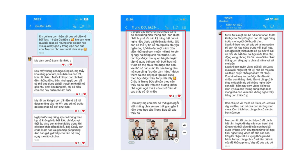 Một phụ huynh chia sẻ: “Cô giáo của con cực kỳ kiên nhẫn. Con mình trước hay ngại nói, nhưng cô luôn động viên nhẹ nhàng, sửa từng lỗi nhỏ và khen đúng lúc. Sau 3 tuần, con đã chủ động nói câu dài hơn và tự tin giới thiệu bản thân bằng tiếng Anh.”