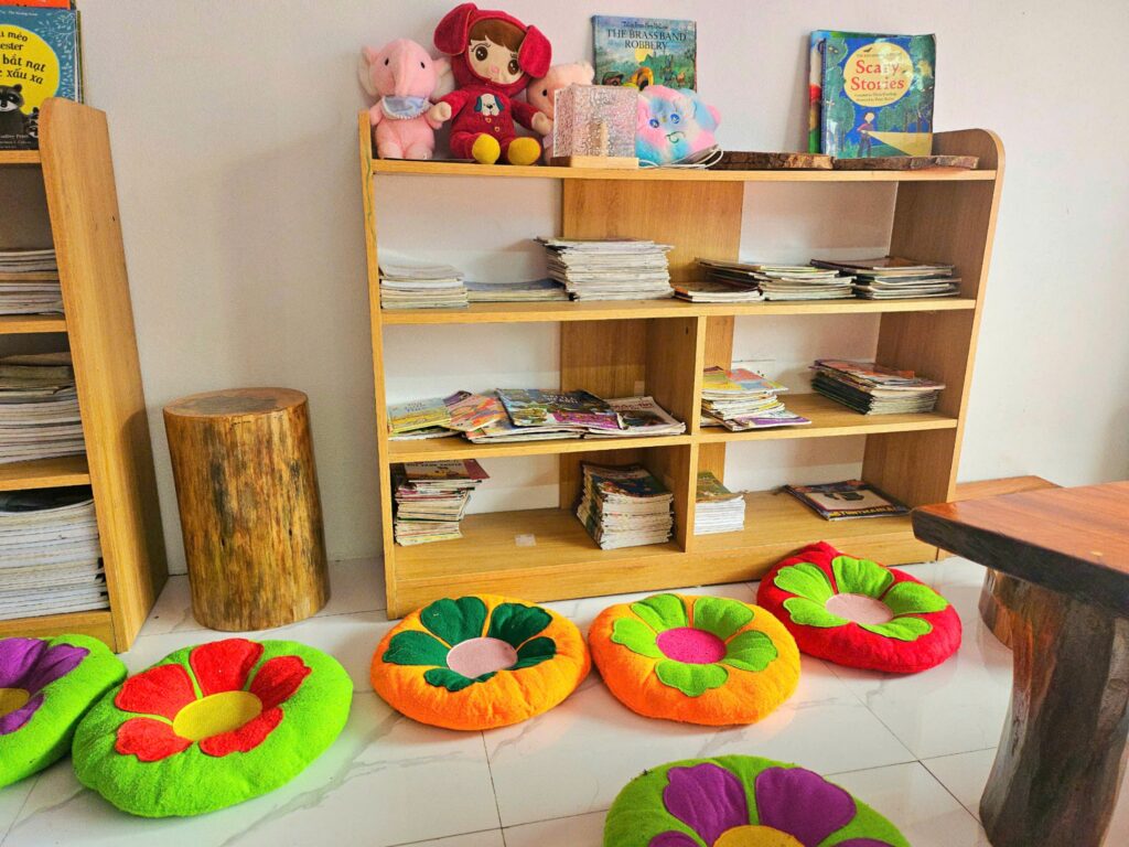 Thư viện được bố trí khoa học với nhiều đầu sách, truyện tranh, tài liệu học tập và học cụ trực quan phù hợp với từng trình độ. Đây là không gian lý tưởng để học viên rèn luyện thói quen đọc, mở rộng vốn từ, tiếp cận kiến thức mới và nuôi dưỡng niềm yêu thích tiếng Anh một cách bền vững.