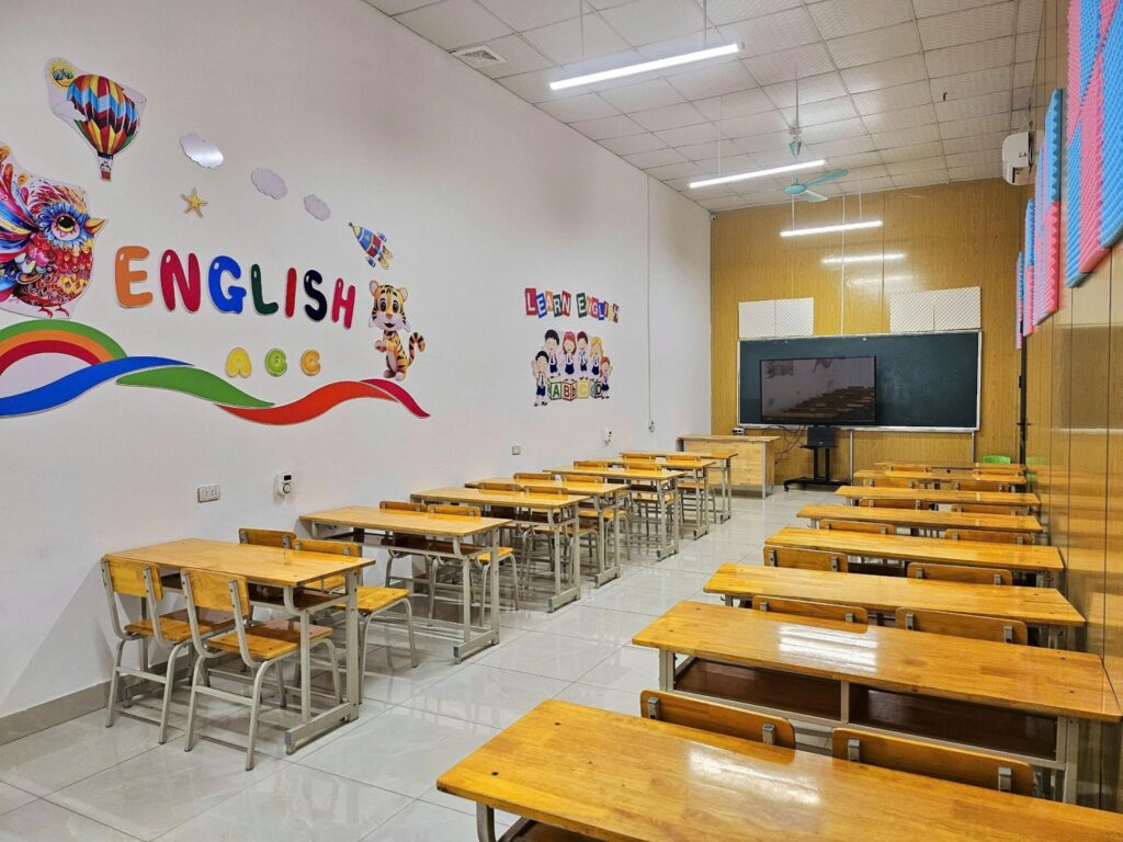 Trung tâm sở hữu 10 phòng học hiện đại được trang bị đầy đủ máy chiếu, bảng tương tác, hệ thống âm thanh và ánh sáng chuẩn, cùng bàn ghế tiêu chuẩn phù hợp cho từng độ tuổi. Tất cả các phòng đều được lắp đặt điều hòa, đảm bảo không gian thoải mái để học viên dễ dàng tập trung. Nhờ sự hỗ trợ của công nghệ, mỗi buổi học trở nên sinh động, trực quan và tối ưu hiệu quả rèn luyện nghe – nói – đọc – viết.