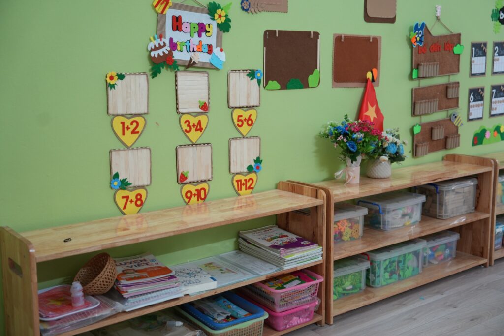- Mỗi phòng học được trang bị đầy đủ bàn ghế, giáo cụ học tập và đồ dùng sinh hoạt phù hợp với từng lứa tuổi. Không gian được bố trí khoa học, giúp trẻ dễ dàng di chuyển, khám phá và học tập một cách chủ động, thoải mái.