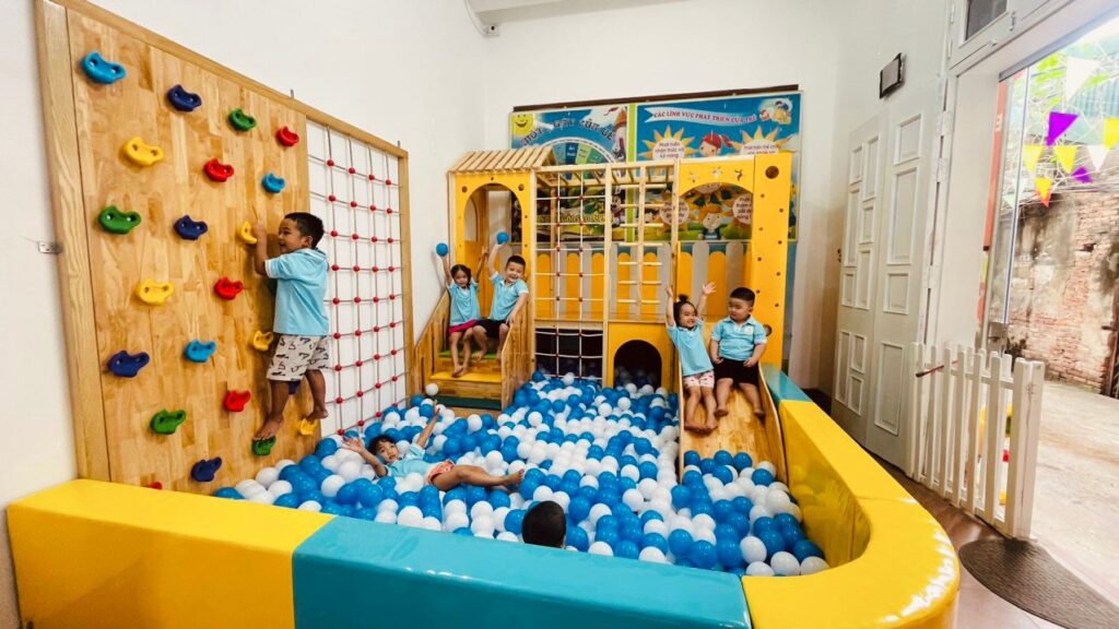 - Ngoài lớp học, các bé còn được thỏa sức vận động trong khu vui chơi trong nhà rộng rãi, nhiều trò chơi hấp dẫn. Không chỉ giúp rèn luyện thể chất, khu vực này còn là nơi trẻ giao lưu, kết nối và học cách chơi cùng nhau – điều mà không cuốn sách nào dạy được.