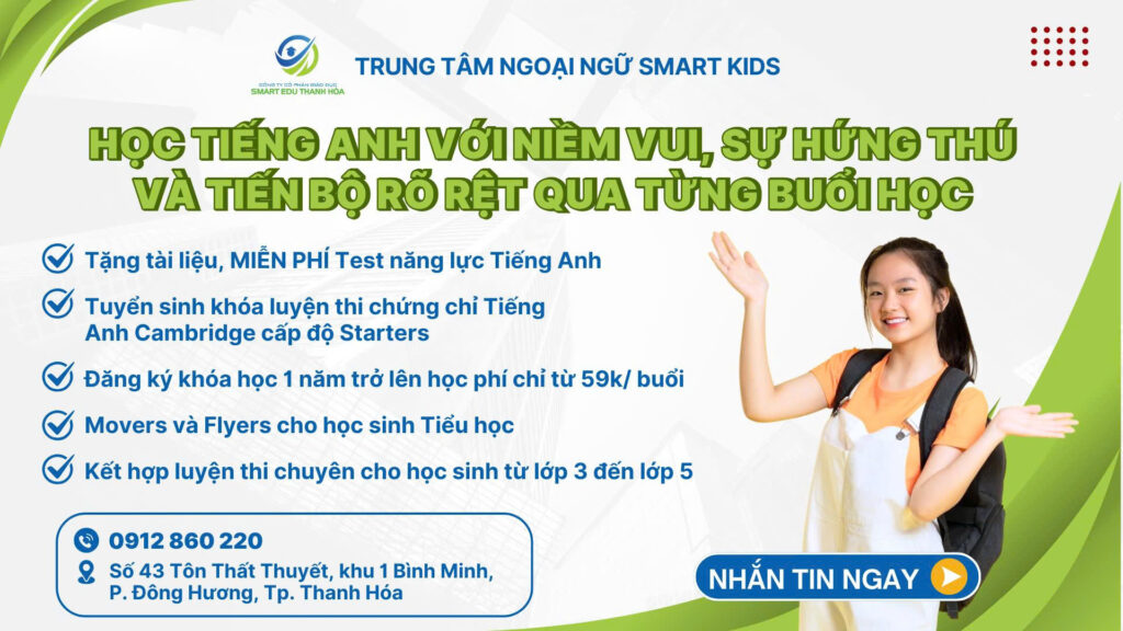 Trung Tâm Ngoại Ngữ Smart Kids – Thành phố Thanh Hóa không chỉ là nơi cung cấp kiến thức tiếng Anh chuẩn quốc tế, mà còn là môi trường nuôi dưỡng niềm đam mê và sự tự tin cho mỗi học sinh. Với hệ thống cơ sở vật chất hiện đại, chương trình học bài bản cùng đội ngũ giáo viên tận tâm, Smart Kids cam kết đồng hành cùng con trên hành trình chinh phục ngôn ngữ, mở ra cánh cửa tương lai rộng mở. Nếu ba mẹ đang tìm kiếm một trung tâm ngoại ngữ uy tín, chất lượng và thân thiện tại Thanh Hóa, Smart Kids chính là lựa chọn hoàn hảo để bé phát triển toàn diện và tự tin vững bước trong cuộc sống.