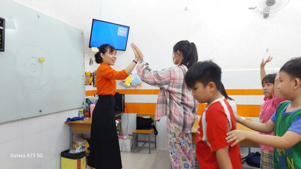 “Phòng học thì sạch sẽ, mát mẻ, đầy đủ thiết bị dạy học hiện đại. Phụ huynh như tôi cảm thấy rất tin tưởng và an tâm.” – chị Hoa mẹ bé Trâm Anh chia sẻ.